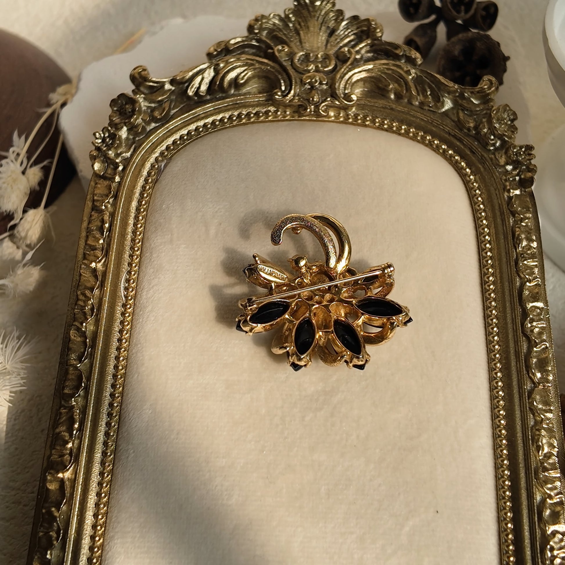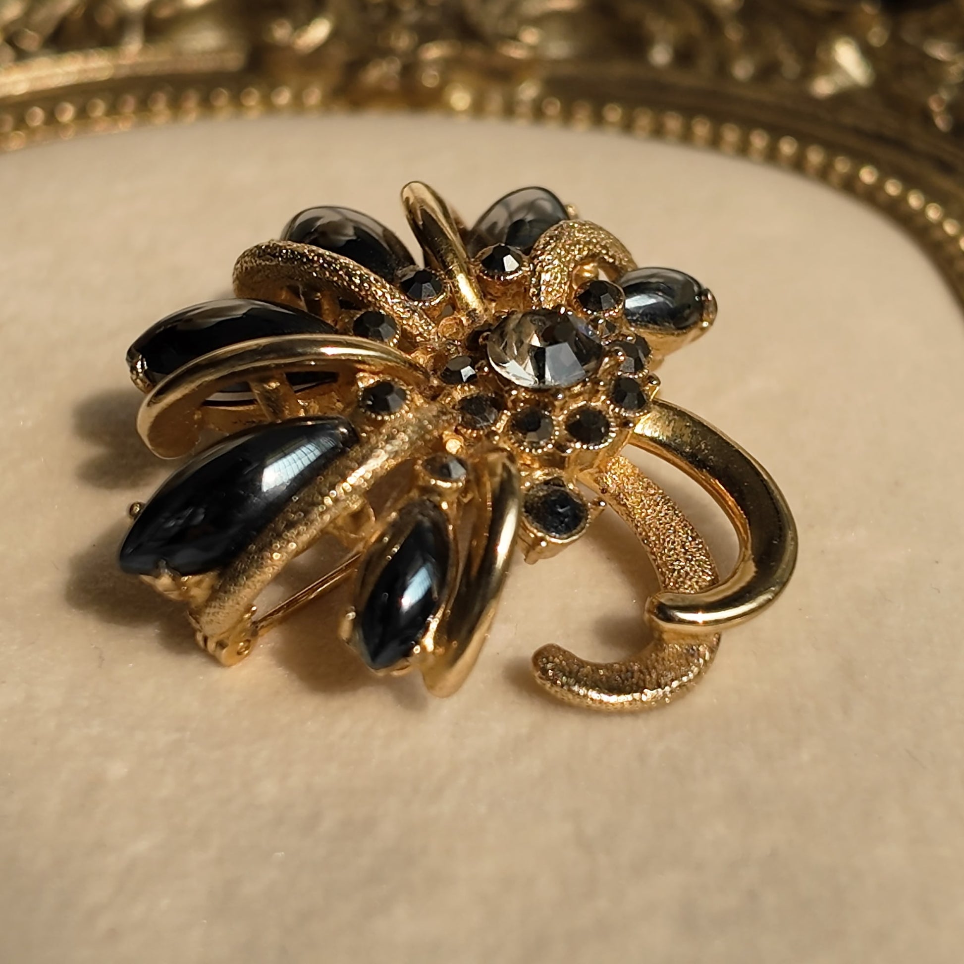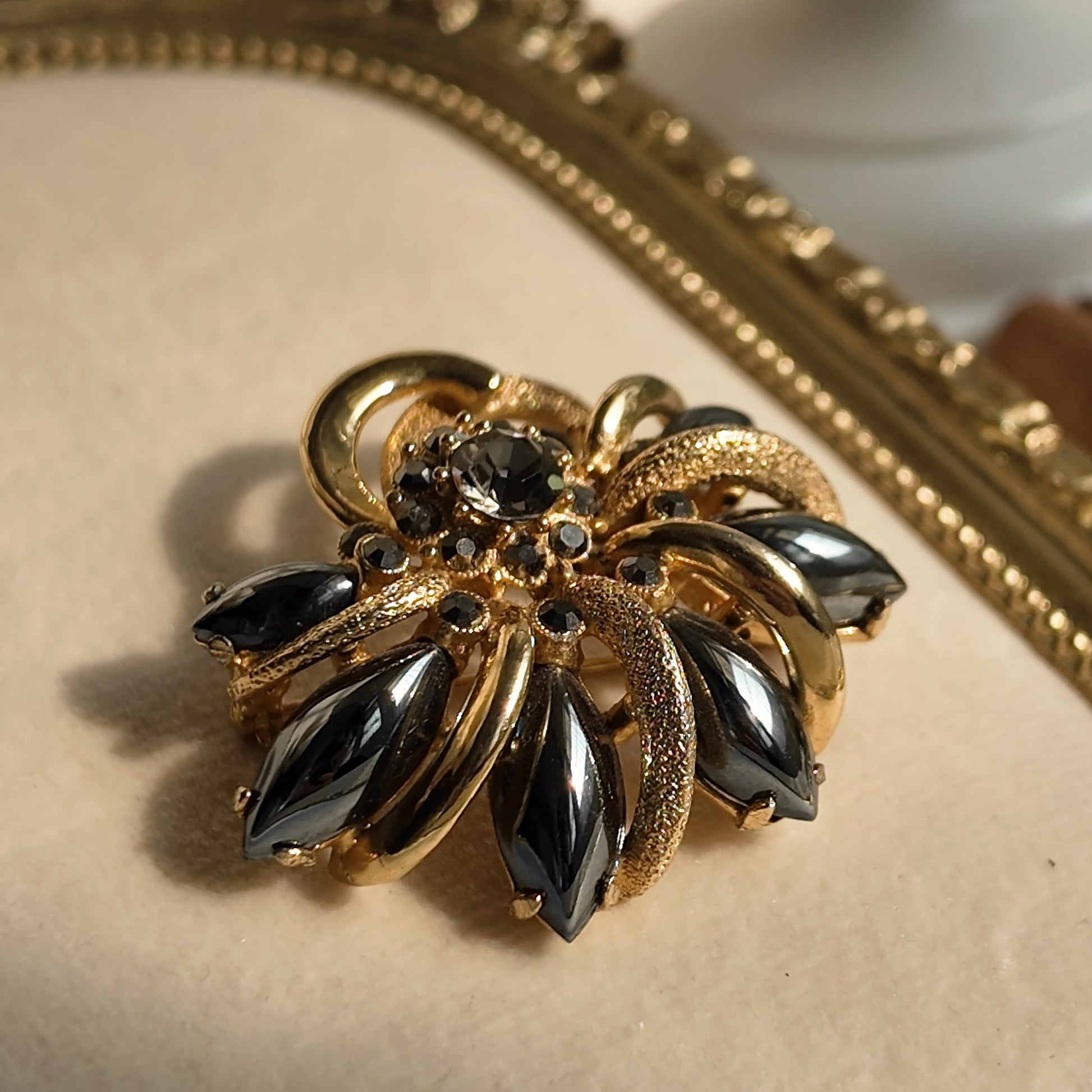 This is not just a brooch; it is a miniature citadel rising from a sea of golden sand. A masterpiece of design and quality by the revered house of Hollycraft, its ginkgo leaf form is a symbol of endurance and timelessness. The rich, heavy gold-tone finish, a tapestry of both polished and textured surfaces, speaks of enduring quality. Nestled within this golden landscape are crystals of smoky grey and deep, obsidian-like black, sparkling with the cool, clear light of a desert night.