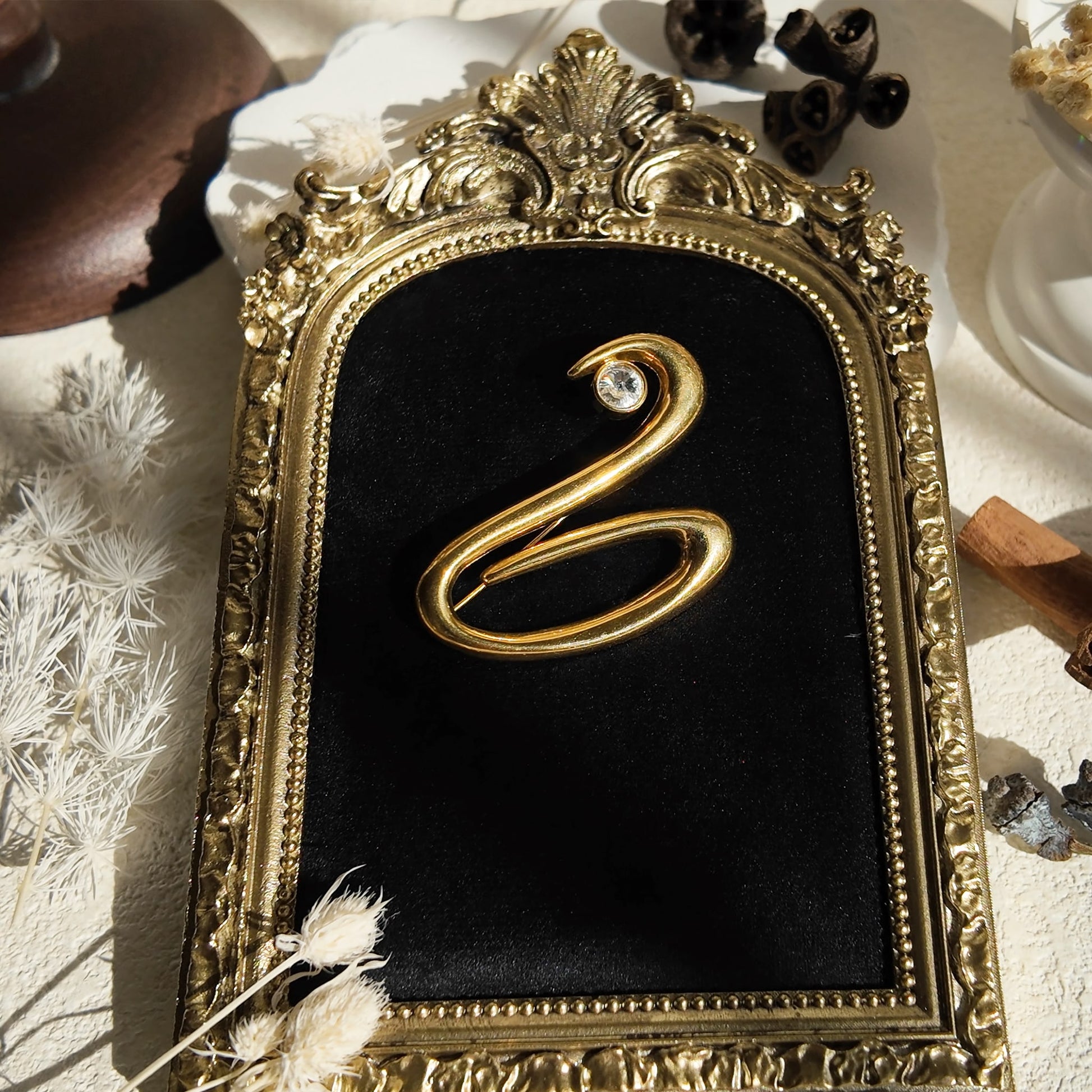 A single, graceful, sweeping line of polished gold-tone metal is masterfully sculpted into the iconic silhouette of a swan, its neck elegantly curved. The design is pure, minimalist, and breathtakingly modern. A single, brilliant-cut crystal rhinestone forms the eye, a tiny, unexpected flash of light that brings the entire piece to life.