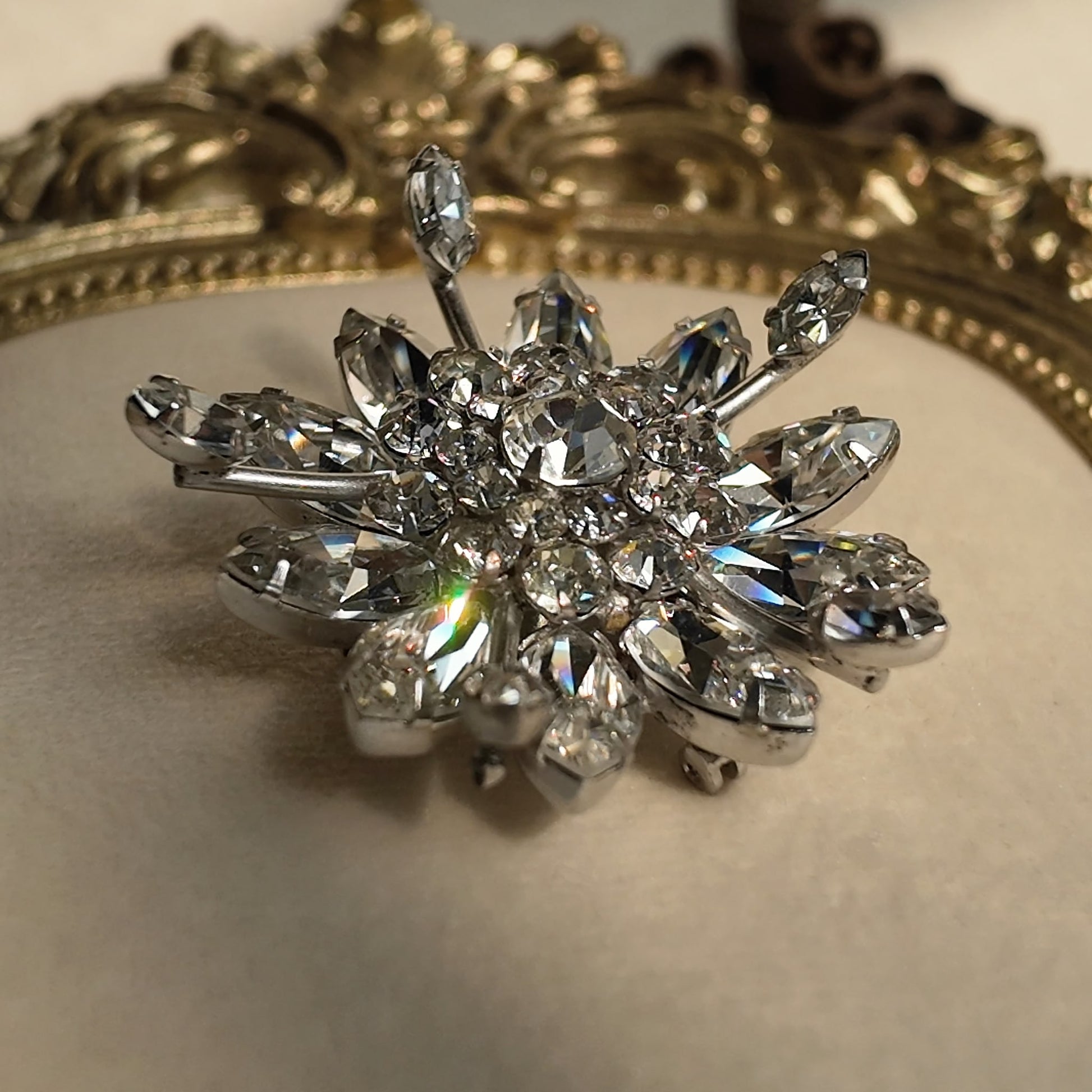 Like a perfect, geometric snowflake or a mystical ice lotus, this piece is a masterclass in dimension and light. Layers of brilliant, ice-clear Austrian crystals are meticulously hand-set in an ornate, silver-tone frame. The quality of the stones is so exceptional, they explode with a fiery, diamond-like brilliance under any light, appearing almost new.