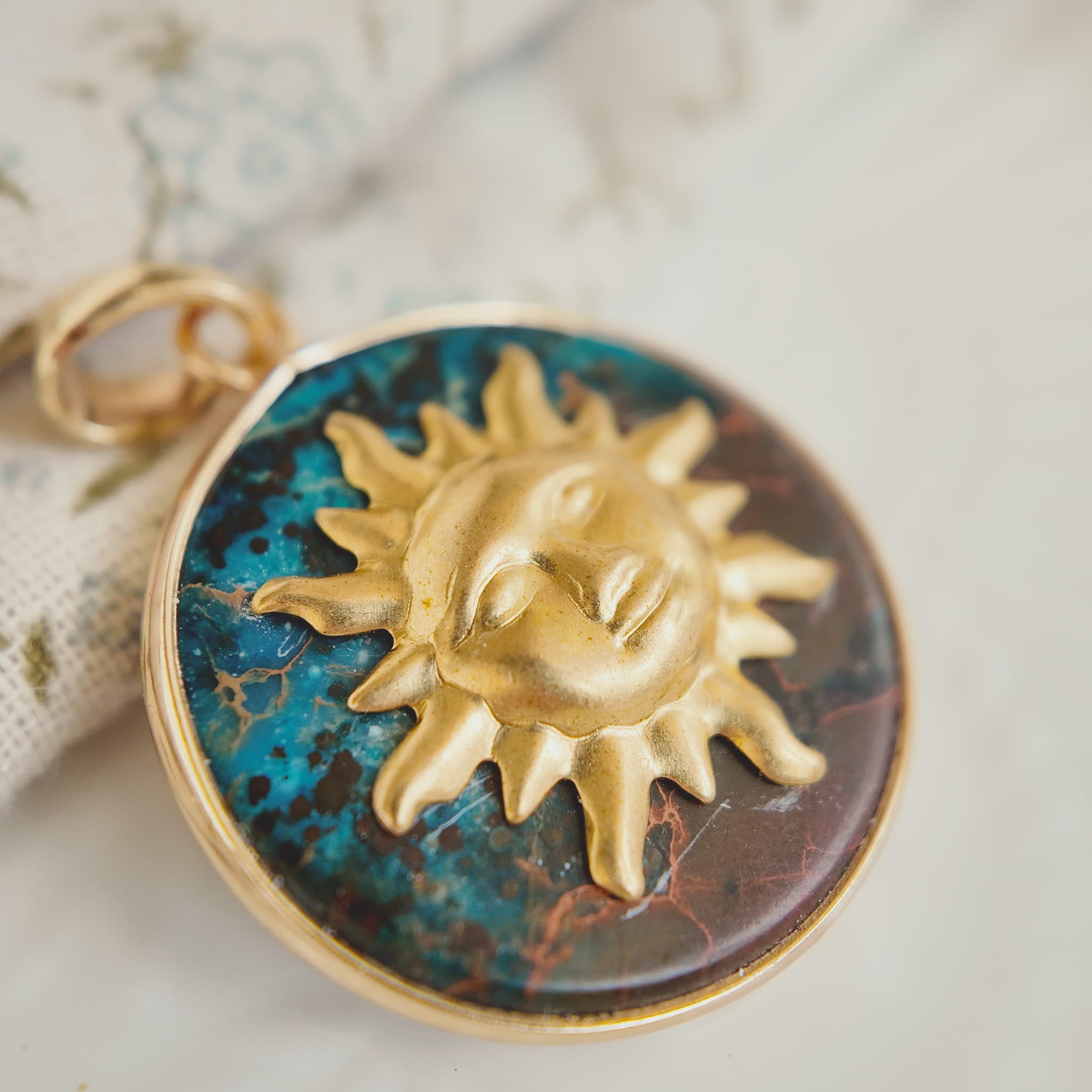 Materials: Natural Stone (Interwoven Red & Blue Hues, Nebula Patterns), Vintage Pure Copper Sun Face, Gold-Plated Bezel