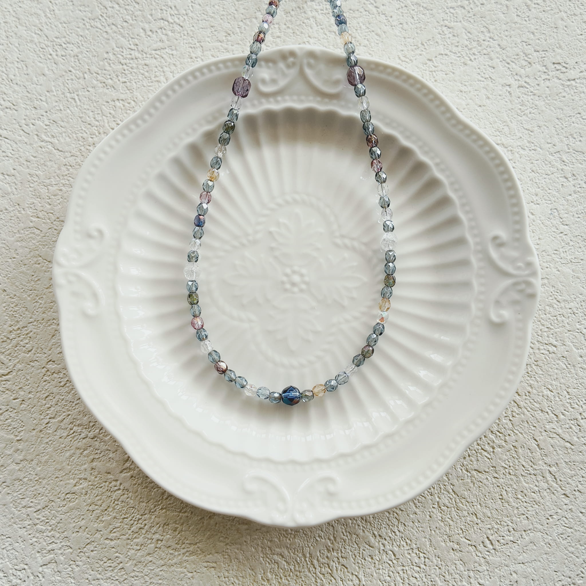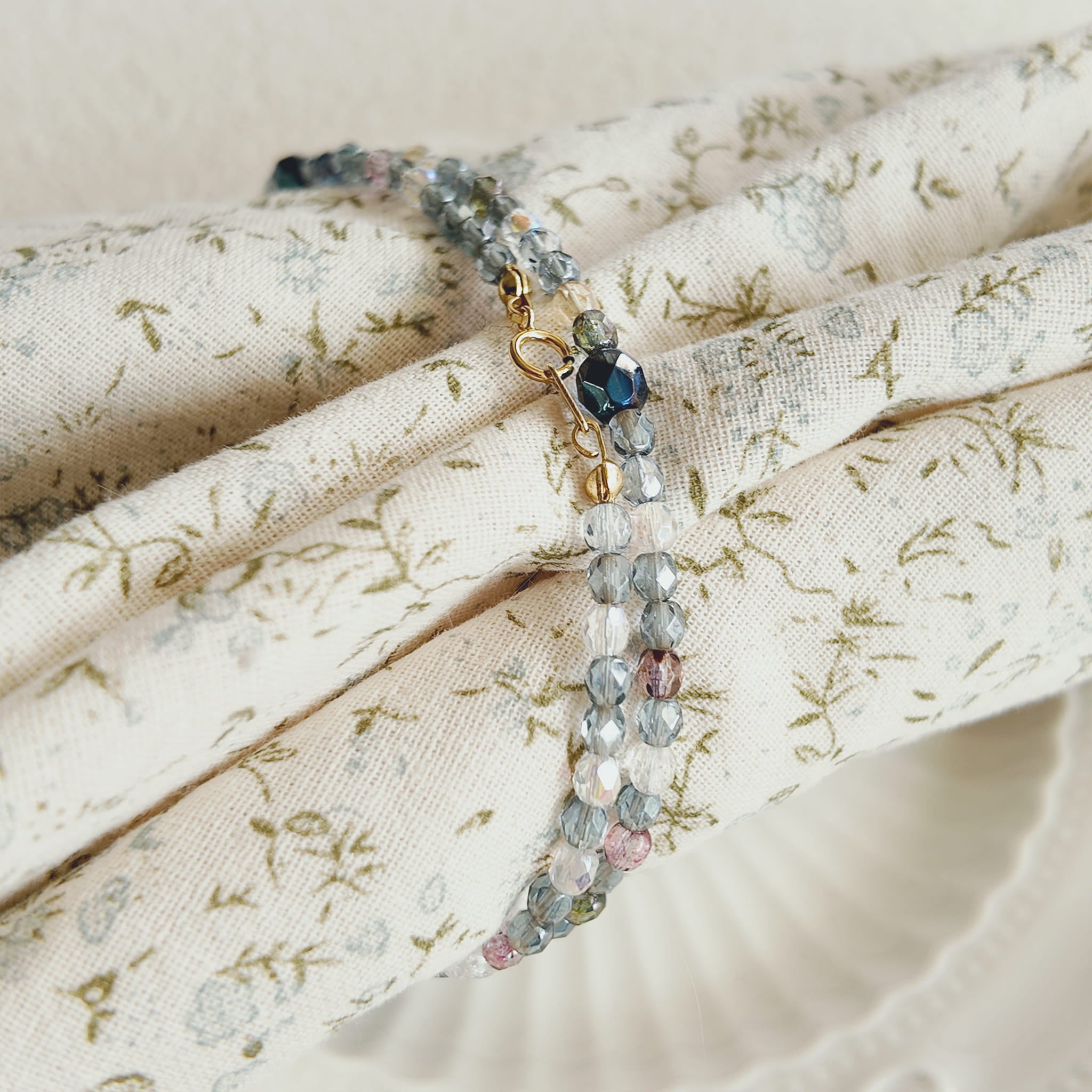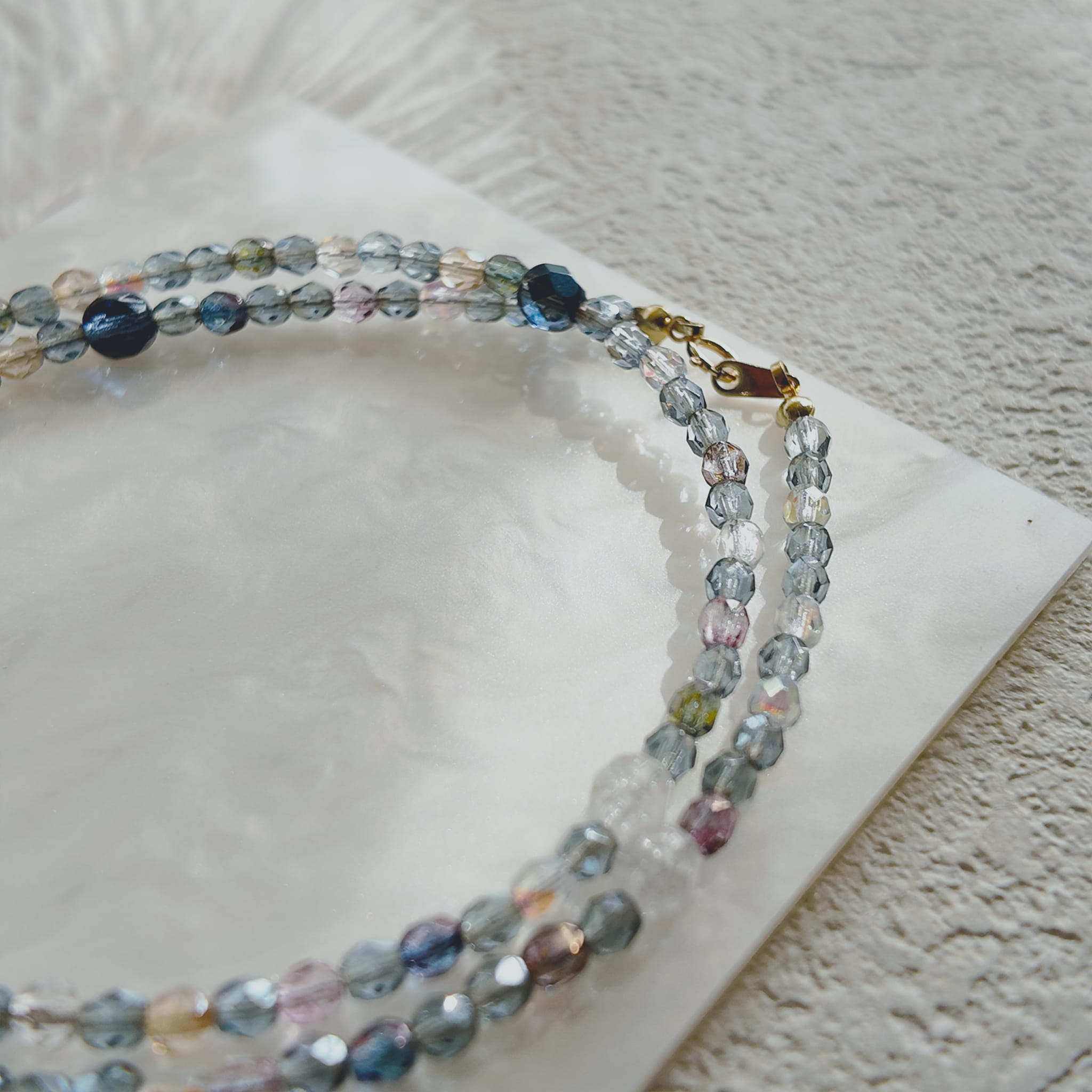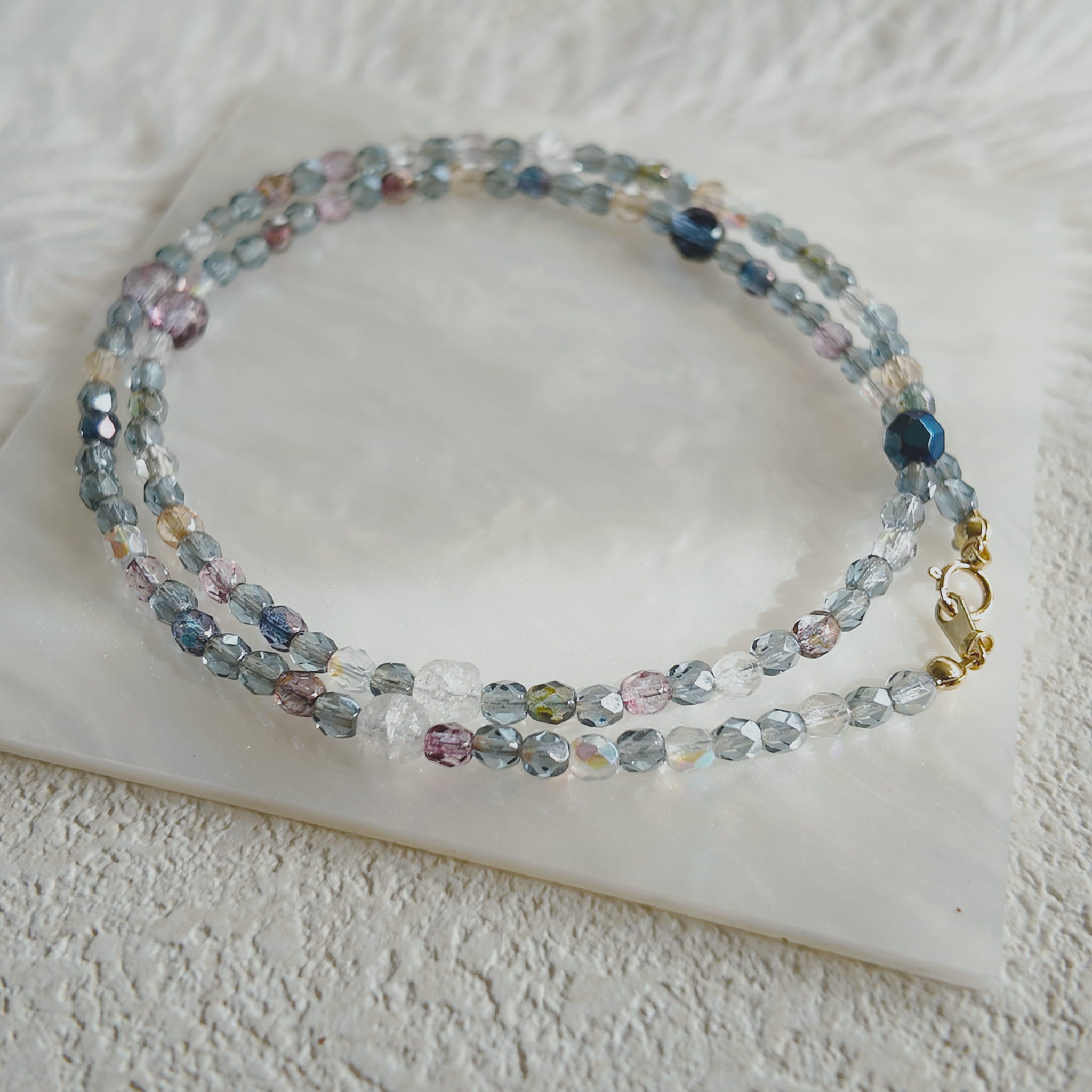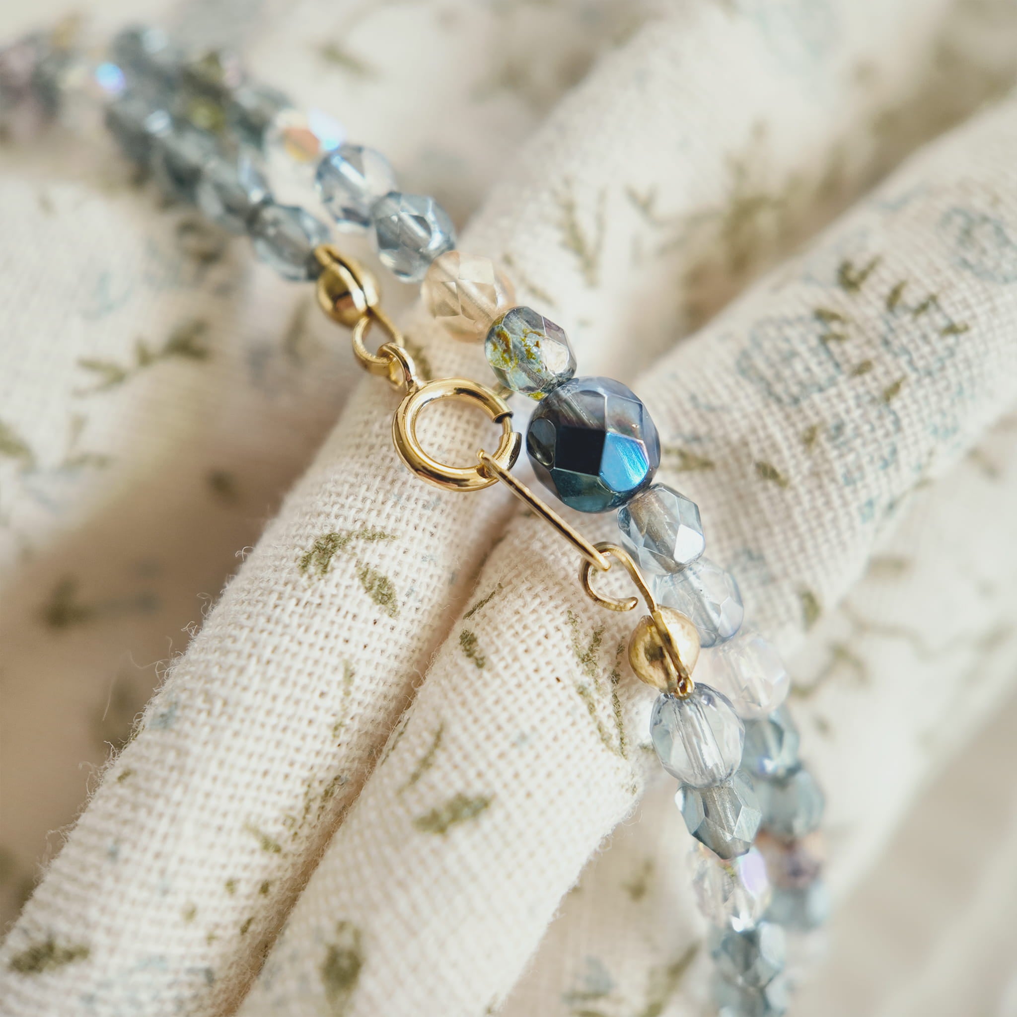Materials: Multi-Faceted Czech Glass Beads (Blue, Transparent, Purple, Yellow Hues), AB Iridescent Coating, 18K Gold-Plated Brass Clasp