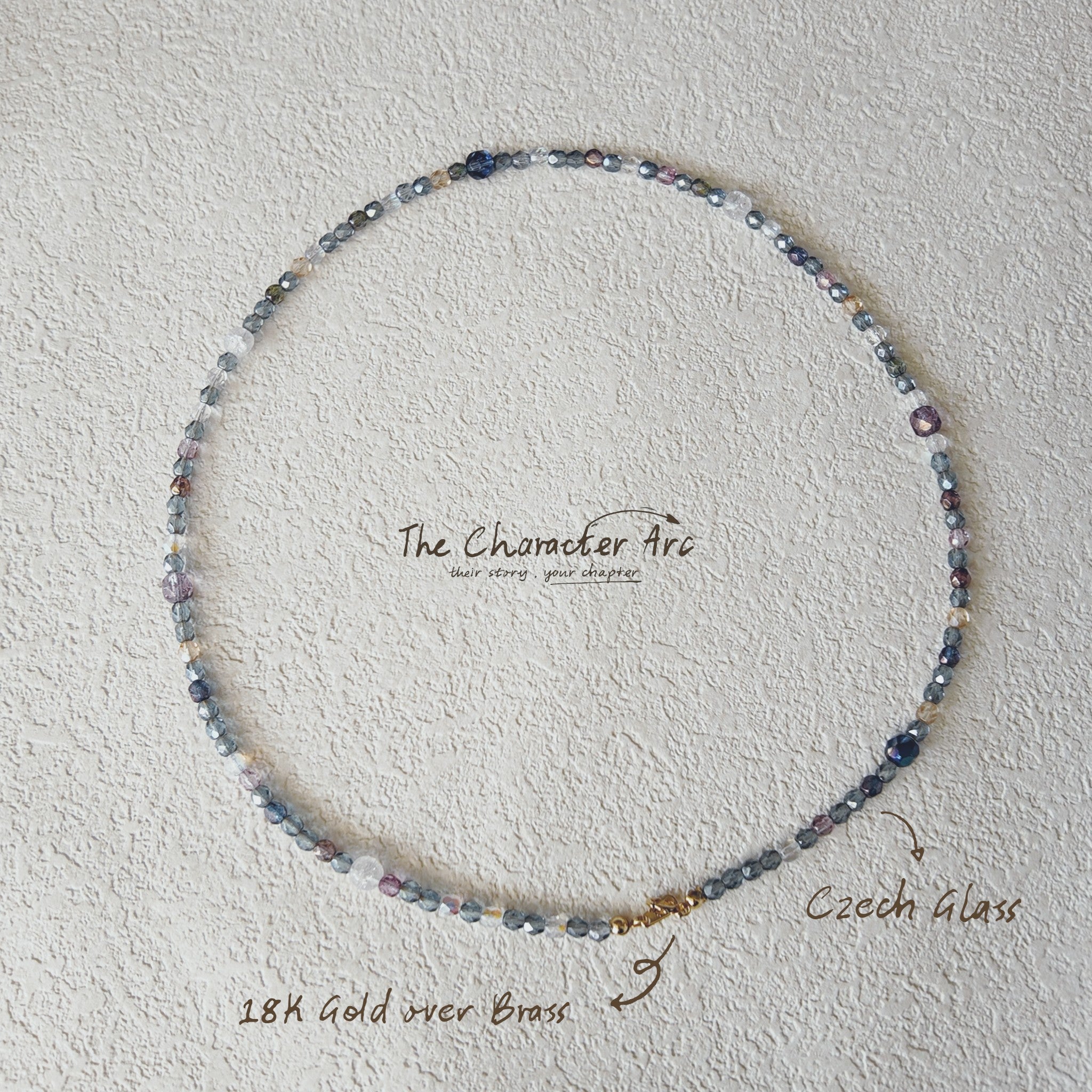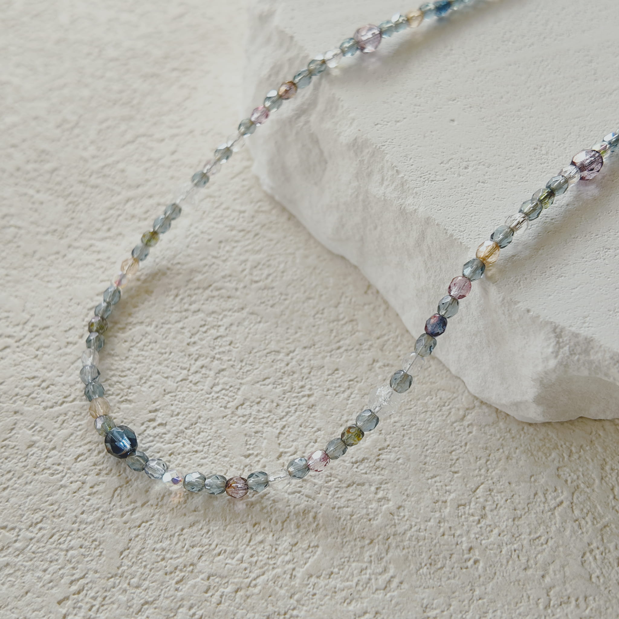This captivating necklace is a vibrant tapestry woven from meticulously crafted multi-faceted Czech glass beads, each a delicate 4mm in size. The dominant shade of dazzling blue serves as a base, interspersed with random yet harmonious splashes of purple, transparent, and sunny yellow beads. What makes this piece truly mesmerizing is the AB (Aurora Borealis) iridescent coating applied to these brilliant Czech glass beads, causing them to erupt in a kaleidoscope of shifting colors when they catch the light. Weighing a featherlight 10.8g and extending to an expressive 20 inches, this necklace feels like a tangible piece of a dream, its varied hues and luminous sparkle evoking the enchanting, scattered light patches seen only in the most vivid of reveries. It fastens securely with an 18K gold-plated brass clasp, completing its vibrant and luxurious appeal.
