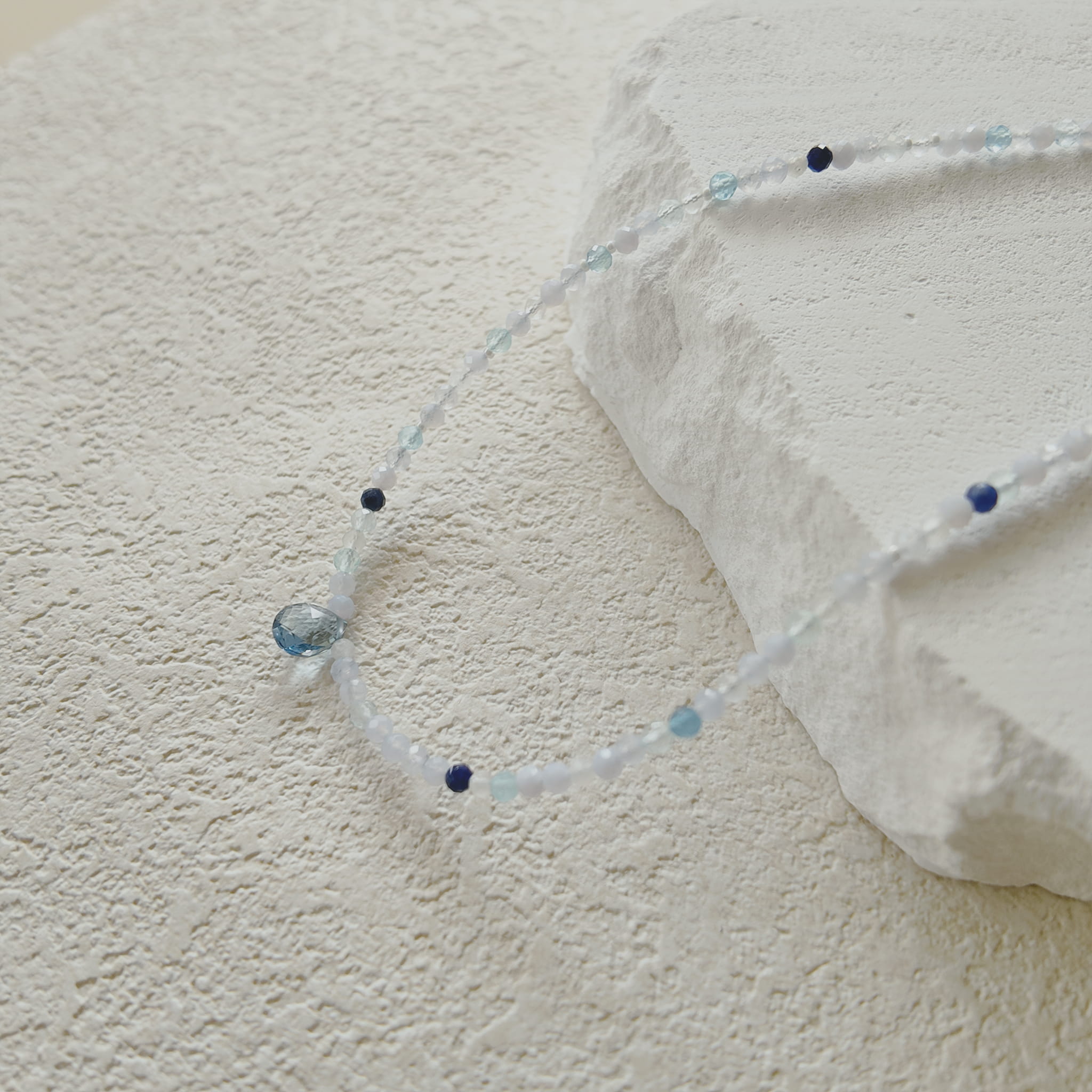 Materials: Multi-Faceted Natural Aquamarine Beads (Light Blue), Miyuki Pearl White Rice Beads, Natural Sodalite Beads (Blue), Blue & Transparent Czech Glass Beads, Multi-Faceted Waterdrop Blue Crystal Dangle, 18K Gold-Plated Brass Clasp