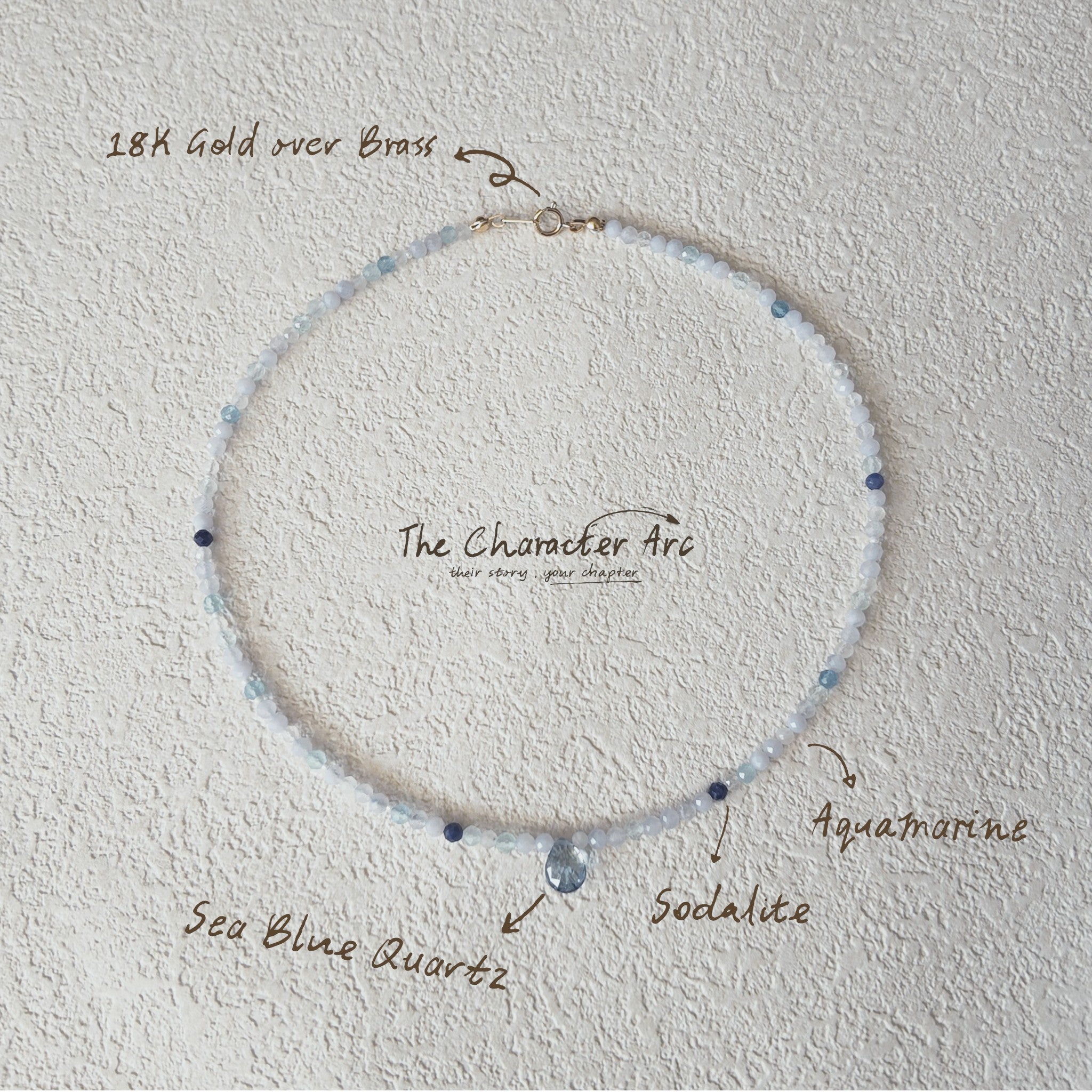 This captivating necklace is a symphony of subtle blues and pure whites, crafted to evoke a tranquil oceanic dream. It features a delicate strand of 3mm multi-faceted Natural Aquamarine beads, interspersed with creamy Miyuki pearl white rice beads, and deeper blue Natural Sodalite beads. The design is further enhanced by shimmering blue and transparent Czech glass beads, creating a fluid, enchanting pattern. A prominent multi-faceted waterdrop blue crystal gracefully dangles at its center, catching the light like a teardrop from the sea. At a featherlight 6.1g and a dainty 15 inches, this piece feels like a cherished treasure found on a pristine shore. Fastened securely with an 18K gold-plated brass clasp, it whispers tales of forgotten coves and endless blue horizons.