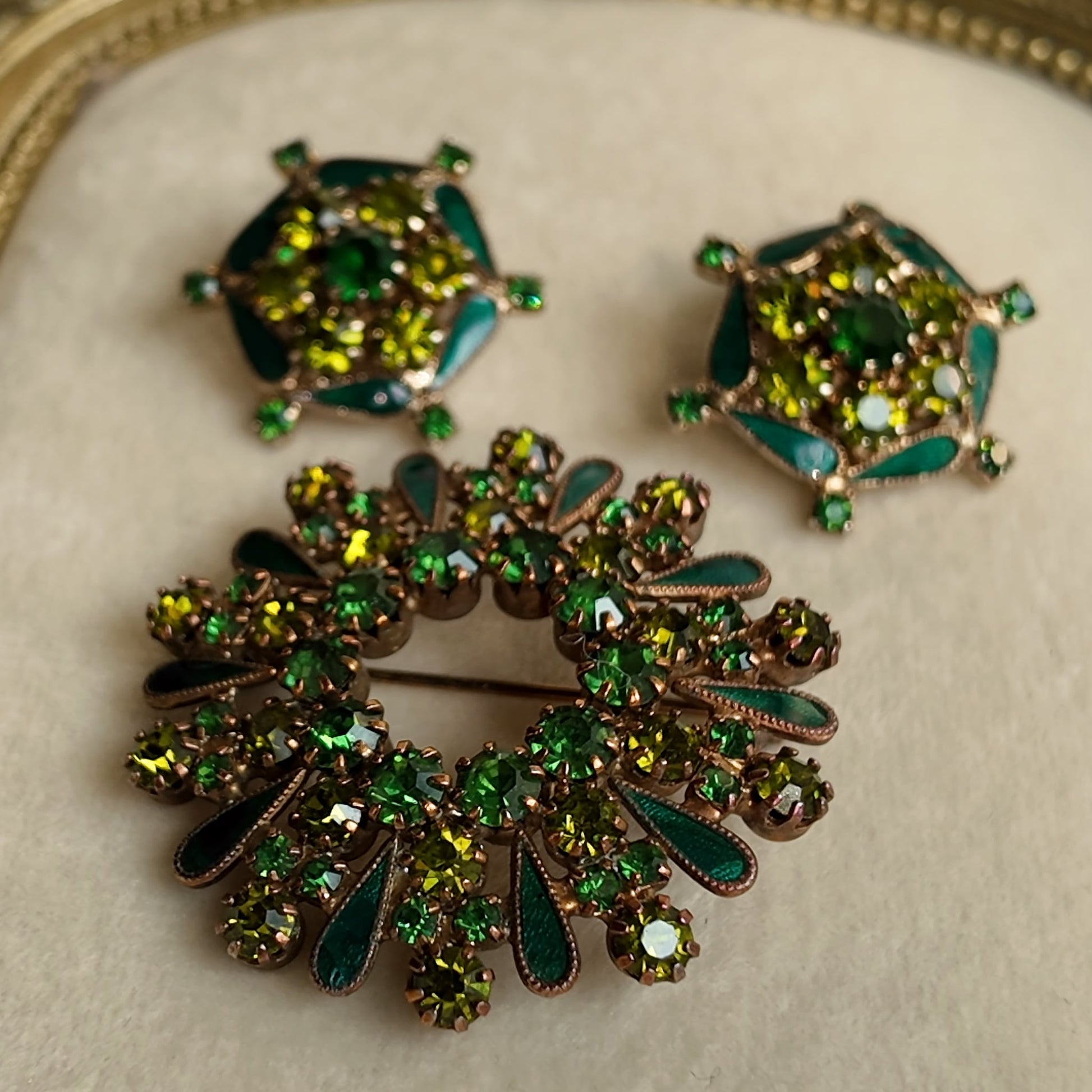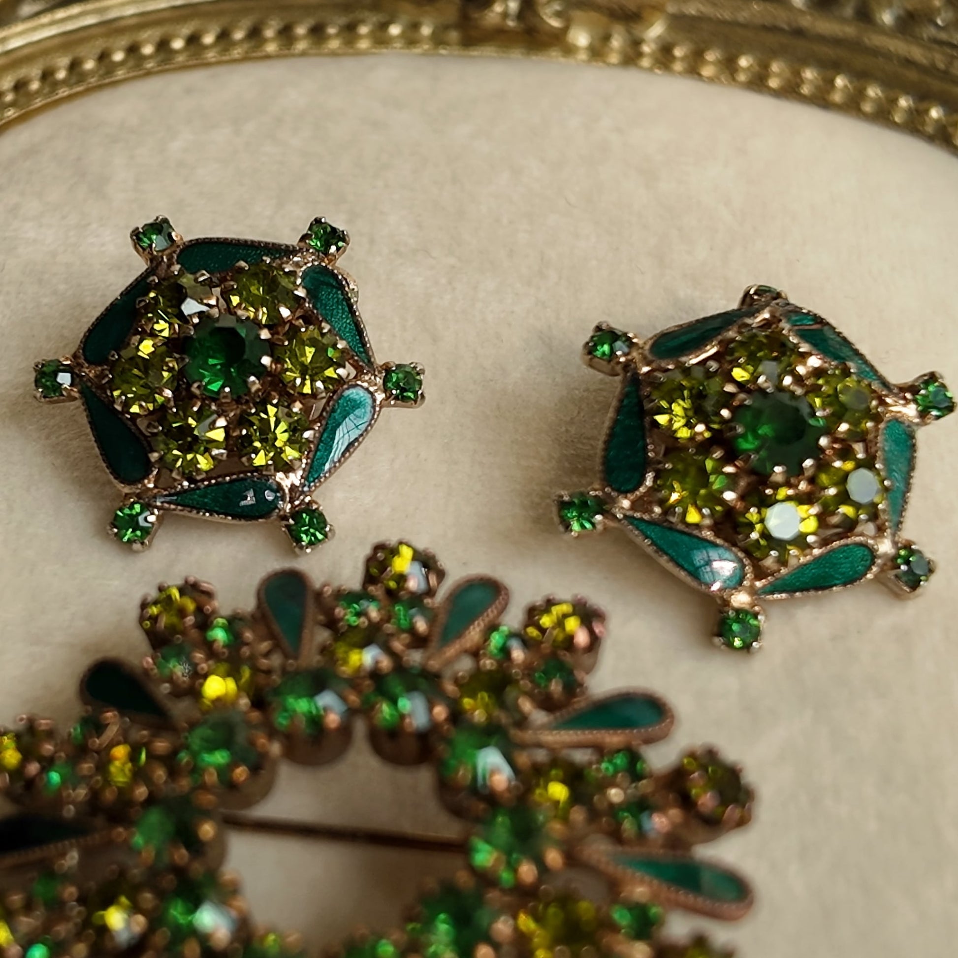 This Weiss set is not just jewelry; it is a moment of impossible beauty, captured forever. Like a brilliant firework exploding against a bronze twilight sky, its design bursts with life. A dazzling array of olivine and emerald green rhinestones radiate outwards, their sparkle punctuated by deep, lustrous teardrops of green glass.